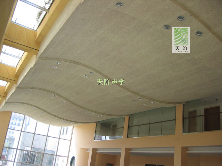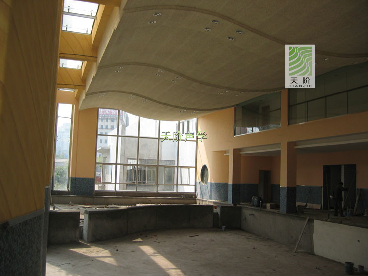 上海大學(xué)游泳館工程使用了1200方的木絲吸音板,安裝在天花,不僅美觀。對(duì)各種頻段的吸聲效果的很明顯,可以有效避免回聲。