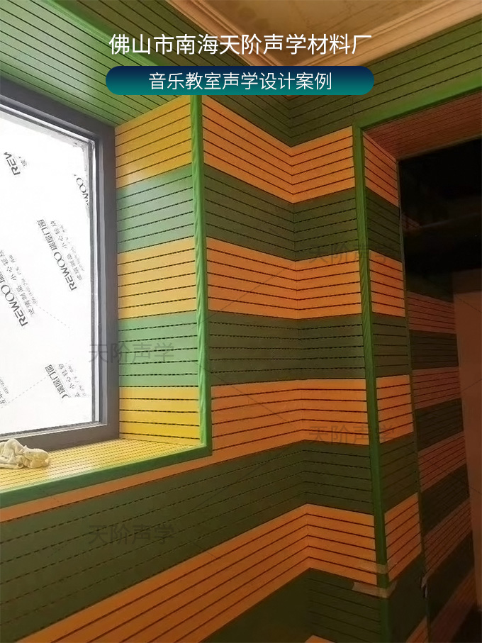 音樂教室聲學設計案例 ,墻面使用條形槽木吸音板,鮮艷的三聚氰胺飾面,青春活力,降噪又美觀。