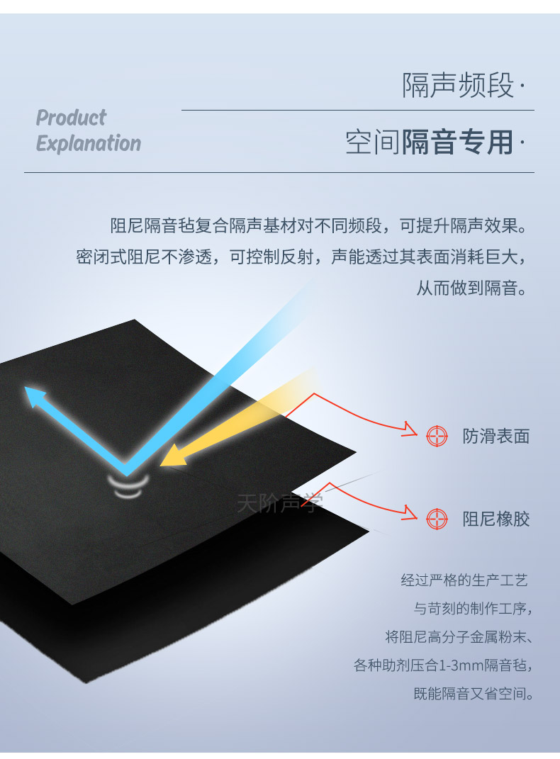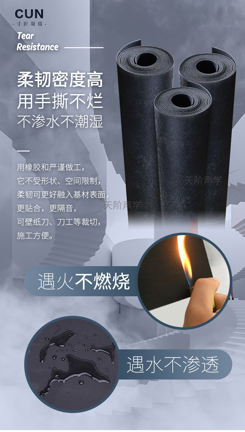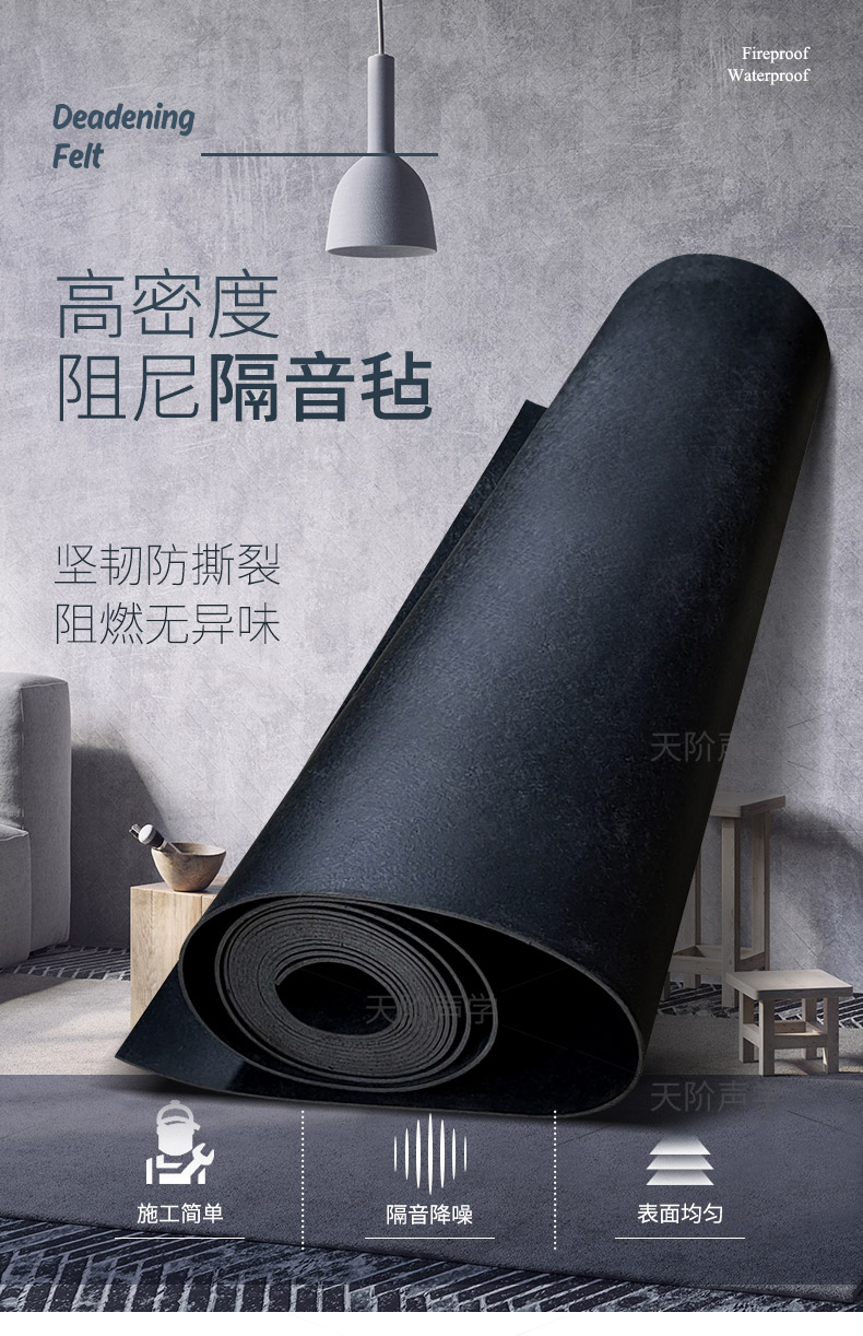 阻尼隔音氈以高純度精細鐵粉為原料,應用新的減震隔音技術,開發研制出針對地板、墻壁、管道的隔音材料。能夠有效地阻隔外界的噪聲,營造一個安全、安靜、舒適的環境。