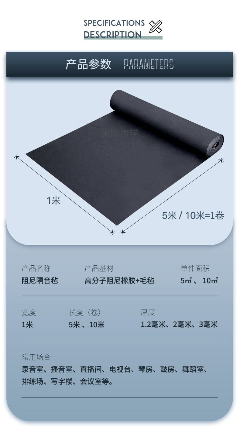 隔音氈材料質輕、薄、柔軟、拉伸強度大,黑色飾面,卷材包裝;