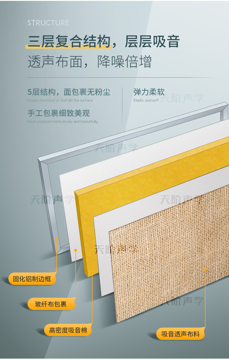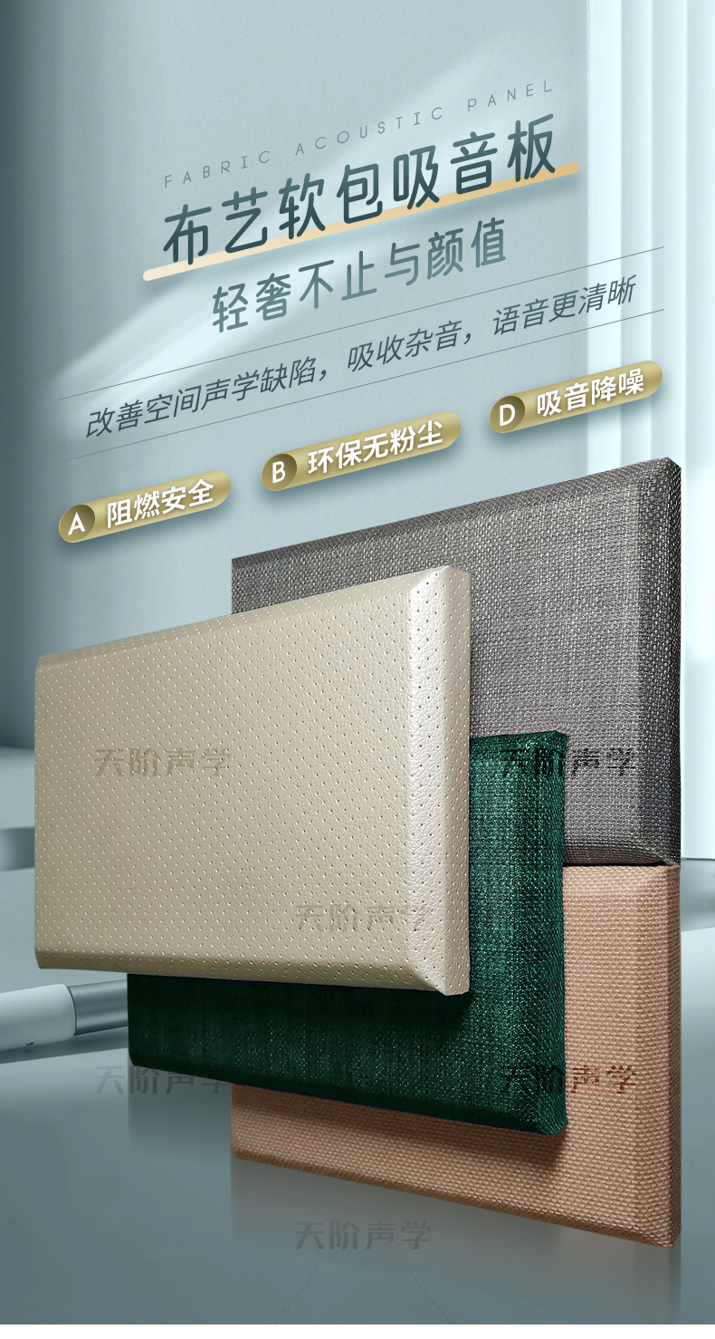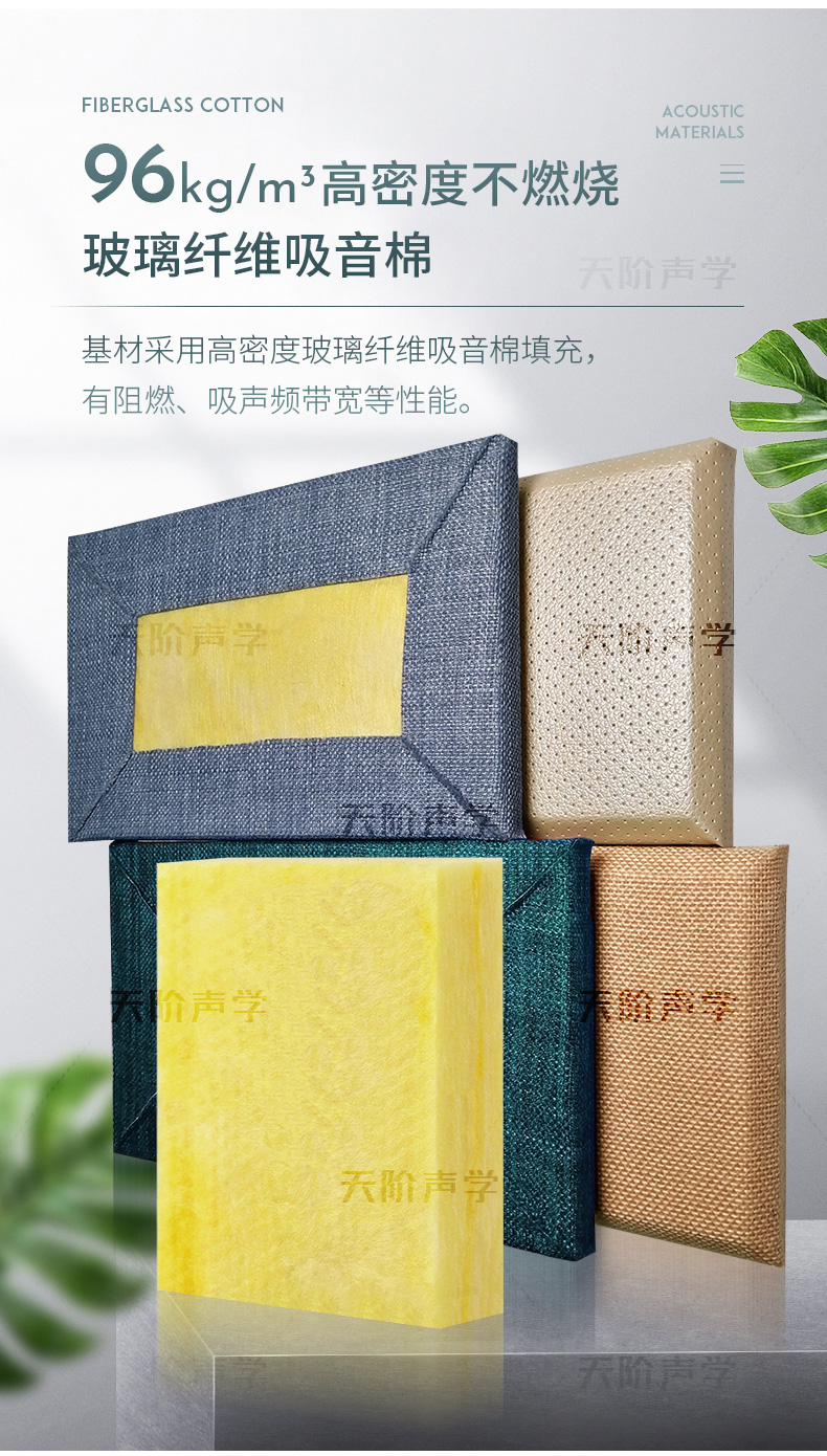 天階聲學(xué)布藝吸聲板采用高質(zhì)的96kg/m3玻璃吸音棉。具有環(huán)保、阻燃、吸聲頻帶寬、裝飾性強(qiáng)、施工簡(jiǎn)單、無(wú)粉塵污染等性能,飾面顏色及材料選擇性廣,能很好地滿足客戶多樣化的聲學(xué)及裝飾需求。