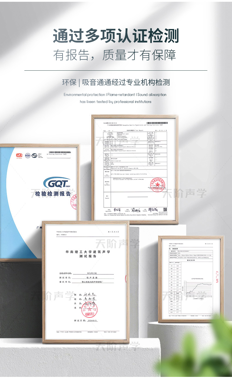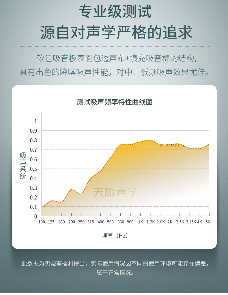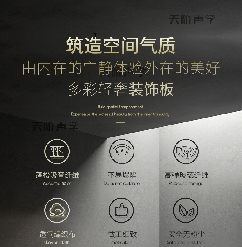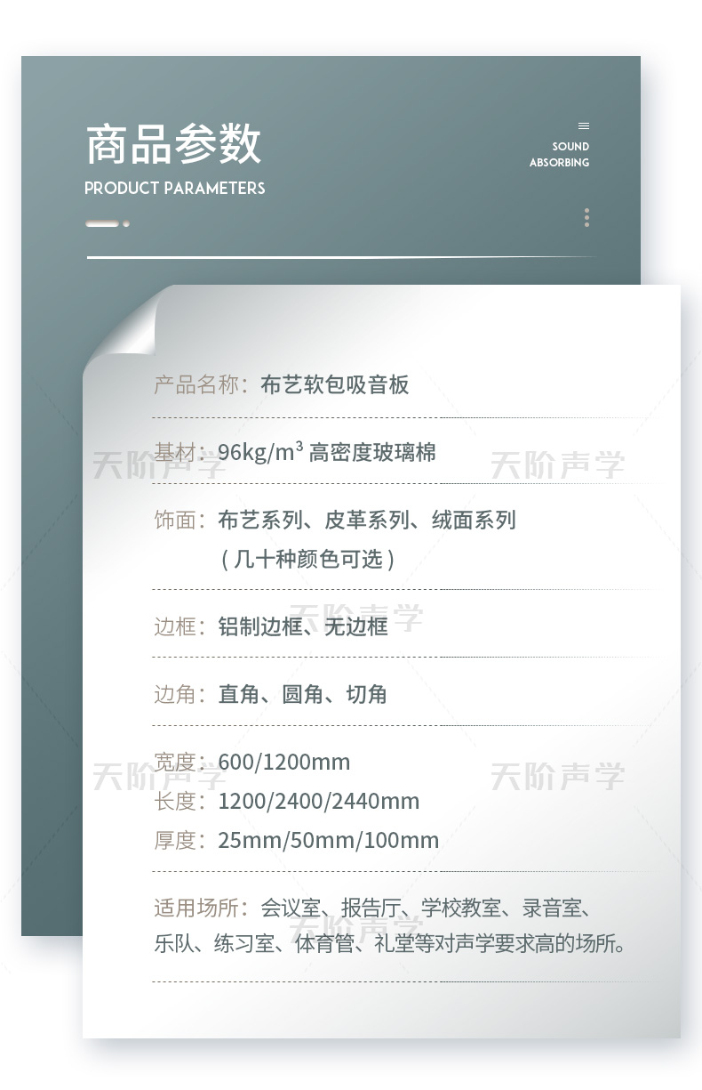 天階聲學(xué)布藝吸聲板采用高質(zhì)的96kg/m3玻璃吸音棉。具有環(huán)保、阻燃、吸聲頻帶寬、裝飾性強(qiáng)、施工簡(jiǎn)單、無(wú)粉塵污染等性能,飾面顏色及材料選擇性廣,能很好地滿足客戶多樣化的聲學(xué)及裝飾需求。