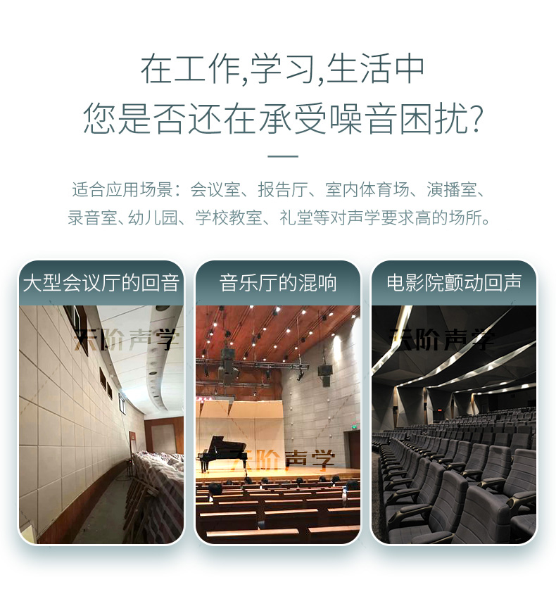 適用場(chǎng)所:詢問(wèn)室、會(huì)議室、報(bào)告廳、學(xué)校教室、演播室、錄音室、樂(lè)隊(duì)、練習(xí)室、室內(nèi)體育場(chǎng)、禮堂等對(duì)聲學(xué)要求高的場(chǎng)所。