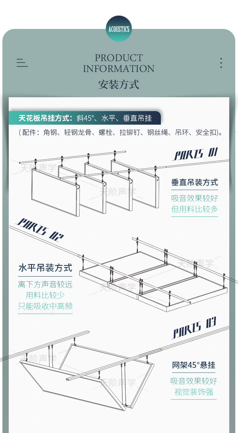 特點:安裝簡單,裝飾效果好,全頻吸音,對低、中、高頻的聲音均有不錯的吸音效果。